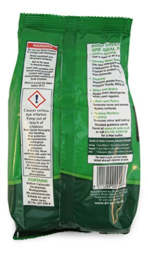 Studio : Dri-Pak Ltd. Publisher : Dri-Pak Ltd. Binding : Grocery Product Description Soda Crystals contain no phosphates, no enzymes, and no bleach. They contain no perfume, and they have no odor. Soda Crystals are easy to use. You mix them with water to make a mild solution, a regular solution, or a strong solution. You can even make a cleaning paste to dissolve stubborn stains. Use Soda Crystals in the kitchen to clean blackened or burnt pans, work surfaces, teapots, tea stained cups, chopping boards, kettles, silverware, floors and tiles and greasy cooker hoods and filters. Remove stains and boost the cleaning power of Soap Flakes or your laundry detergent. To remove stains, soak items stained with grease, grass, blood, ink, wine, tea or coffee in a solution of Soda Crystals and water and break down the stain so your regular wash cycle can easily handle the rest. Soda Crystals can be safely mixed with Soap Flakes, borax and baking soda and have long been a favorite with environmentally conscious consumers as Soda Crystals do not contain phosphates, enzymes or bleaches. They are biodegradable and do not harm your lawn or septic system. While Soda Crystals are not caustic, if you are submerging your hands in a solution for a long time, it is advisable to wear rubber gloves--especially if you have sensitive skin. Keep out of the reach of children. Detergent free. There are approximately 3.5 cups of Soda Crystals per bag. (1kg / 2.2 lb) 0