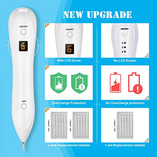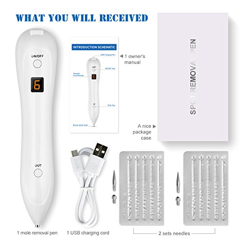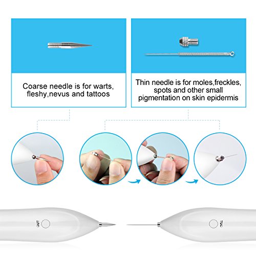 - 【Accessories Complete】12pcs needles set for replacement.The 2pcs coarse needles are designed for warts, fleshy, nevus and tattoos. The rest of 10pcs thin needles are designed for moles, freckles, spots and other small pigmentation on skin