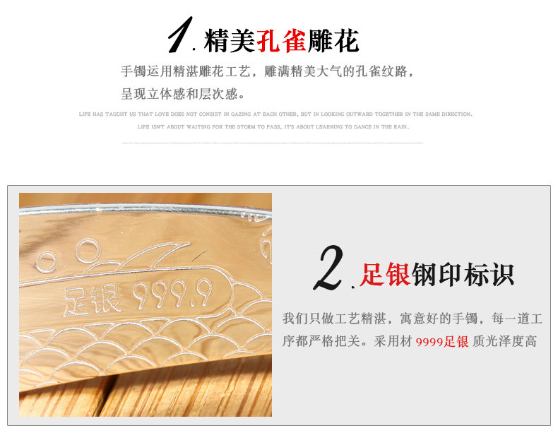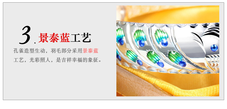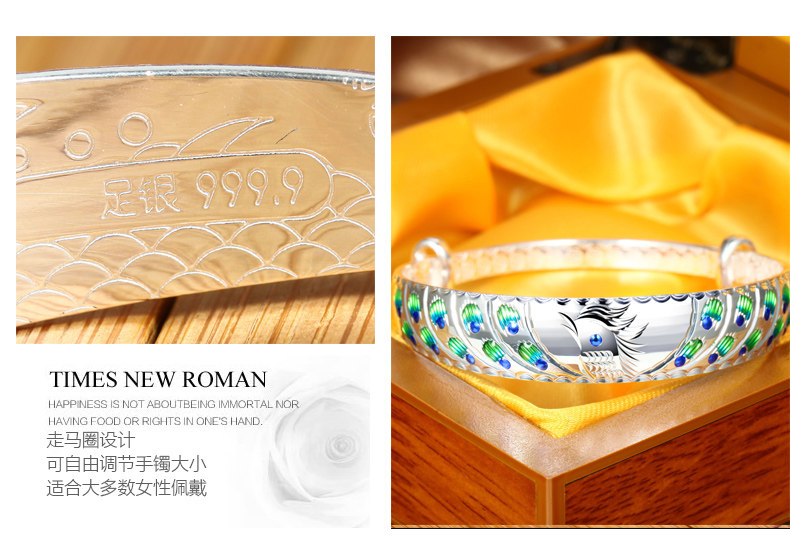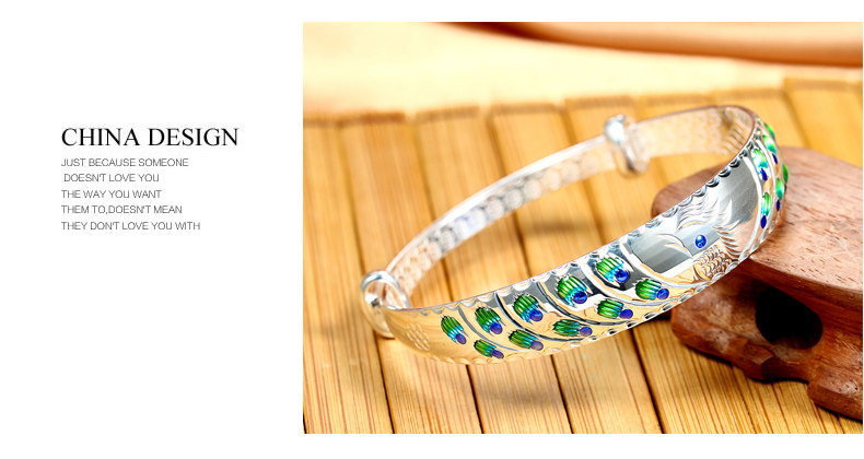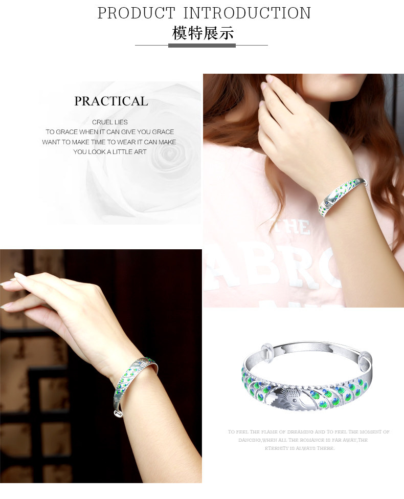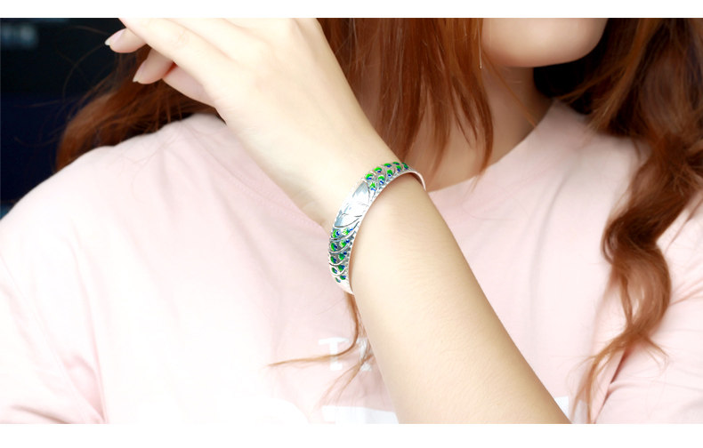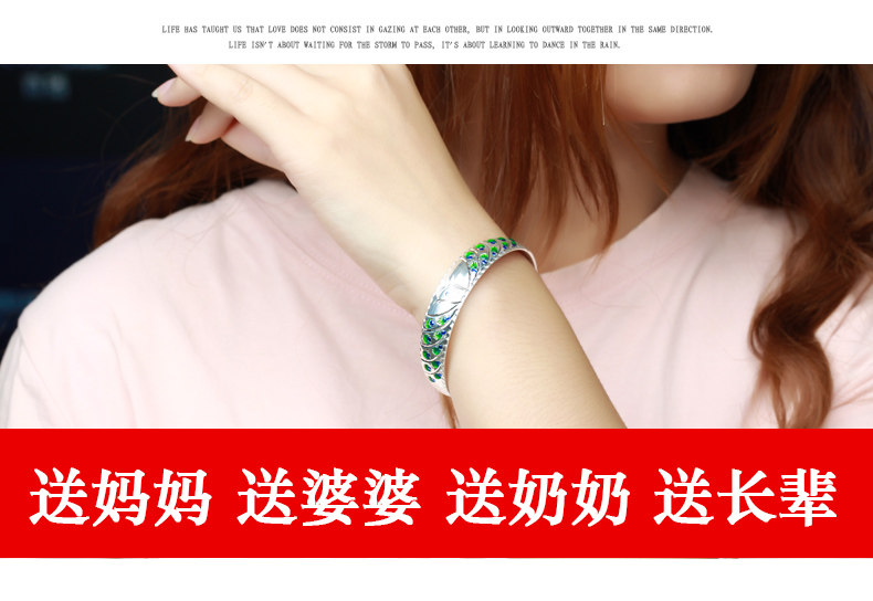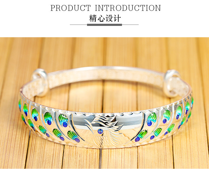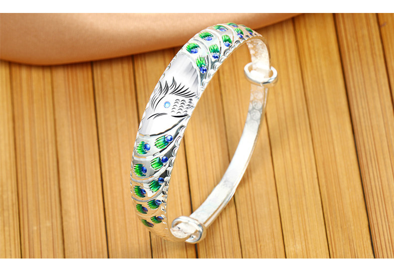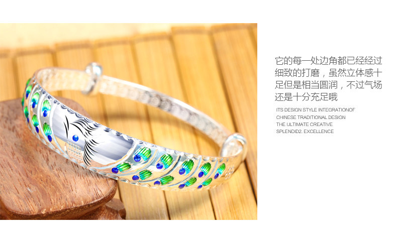 S999纯银手镯女款景泰蓝足银镯子孔雀宽版简约民族送女友妈妈新款