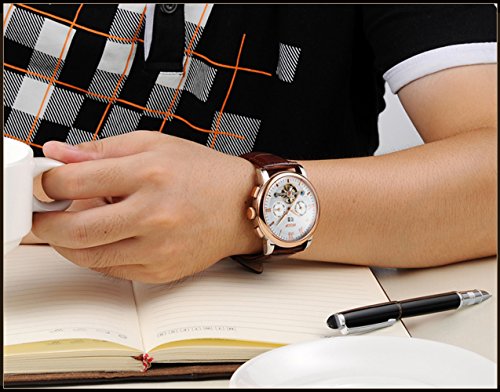 Fanmis브라운 레더 스트랩 자동 스켈리턴 기계 방수 캘린더광 맨즈 손목시계G화이트