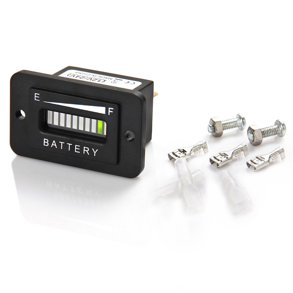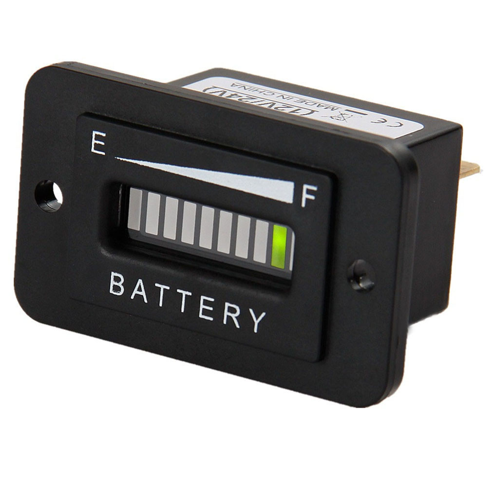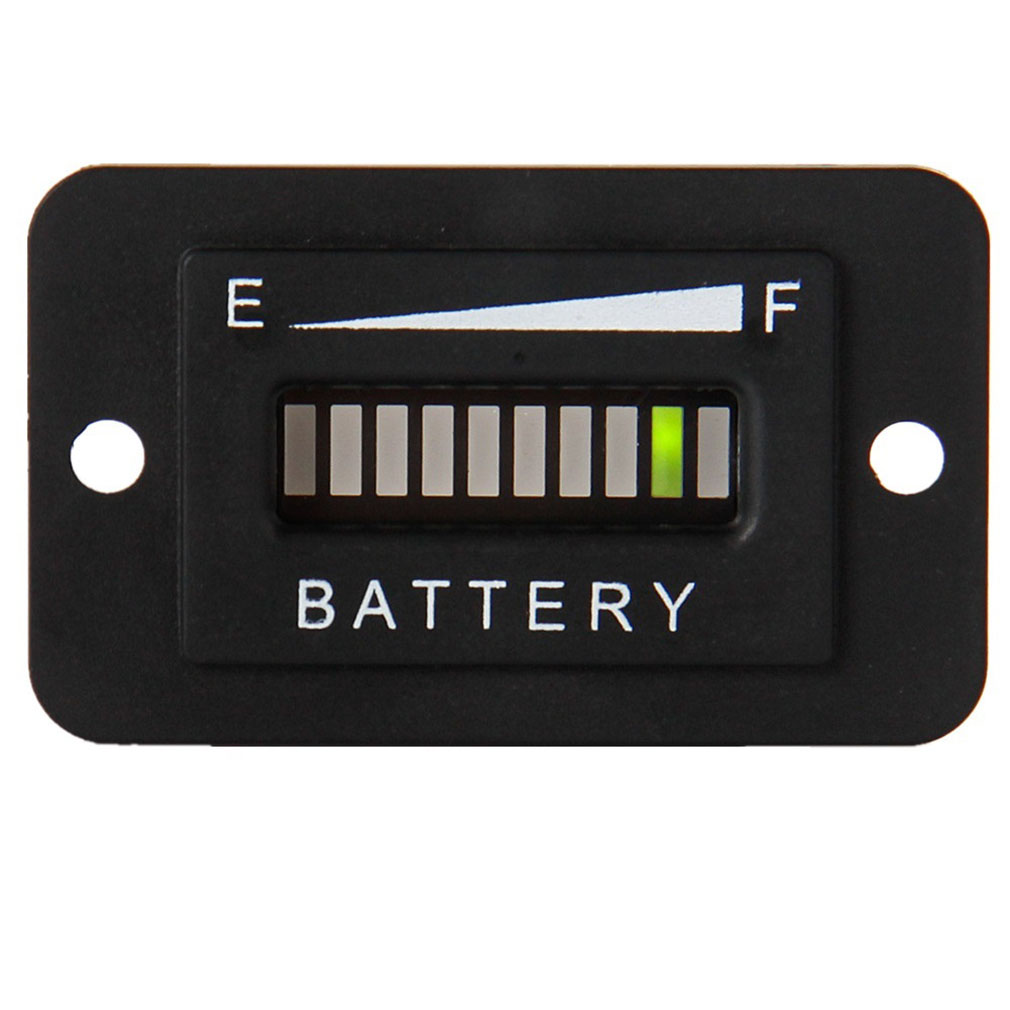 Features: Works with 48V Lead-Acid Batteries in Golf Carts, Forklifts, Trucks, RVs, ATVs, UTVs, Scooters, Boats and More Waterproof, IP65 Temperature Range: -40F to 185F Connection: Pin+ Battery+ Pin- Battery- C-single output for external use Features: Works with 48V Lead-Acid Batteries in Golf Carts, Forklifts, Trucks, RVs, ATVs, UTVs, Scooters, Boats and More Waterproof, IP65 Temperature Range: -40F to 185F Connection: Pin+ Battery+ Pin- Battery- C-single output for external use Operation: Only when the battery is properly charged then the 10th LED (far right) will be lighted. As batterys state of charge decreases, successive LED lights up, only one at a time. When 2nd (from left) LED flashes, indicating ""energy reserve"". When both 1st and 2nd LED flash, indicating ""empty"", new battery is needed to replace old one. Battery indicator memorized the battery state is full when leaving factory. When use with a new battery, it should be powered on for at least 2 minutes to indicate the real battery state. Range indication: Green: 41~100%, Yellow: 21~40%, Red: 20% less. Forklift trucks, Golf Carts, RVs, Boats, Scooters and electric vehicle. etc. Dimensions: Cut-off: 1.5""x1"", distance between holes: 1.75"", depth: 1.5"" Case Style: Front Panel Mount Specifications: Material: ABS Color:Black Size: Approx. 5.3cm x 3.2cm x 3.8cm Weight:Approx. 36 g Package weight:Approx. 46 g Package included: 1 x 48V Battery Indicator 1 x Screw kits