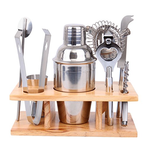 -. Feature : Easy to clean: Stainless steel polished mirror makes this tool kit set very easy maintain. / Durable stainless steel material: Every piece is made of stainless steel for strength, durability. / With wood holder for storage: Just keep everything tucked away in the rack until it's time to make cocktails. / 8 Pieces bar set: Includes shaker, double jigger, strainer, bottle opener, lemon / lime slicing knife, tong, stirrer and wood stand. / Great for home bars and parties: With these essential tools, you'll be able to make a truly perfect martini, margarita or daiquiri like a bartender.