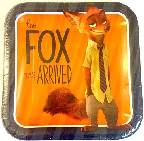 Lunch sized paper plates measure 9in x 9in and feature the con artist fox Nick Wilde with the headline "The Fox Has Arrived."