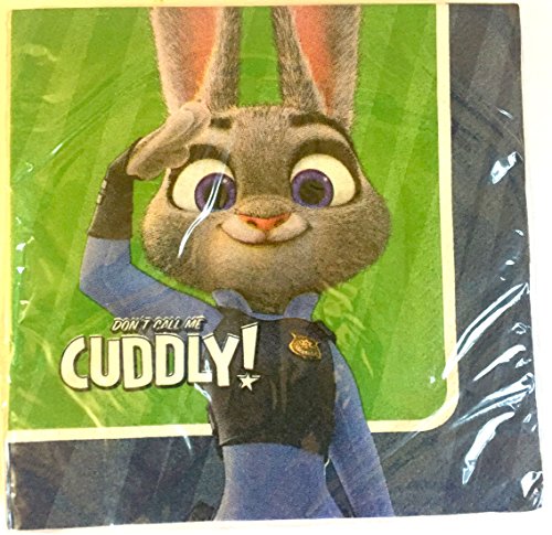 Beverage sized paper napkins measure 5in x 5 in and the rookie cop Officer Judy Hopps is featured against a blue and green backdrop with the headline "Don't Call Me Cuddly."
