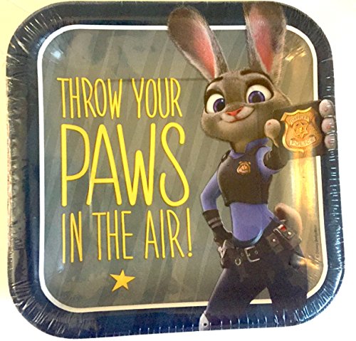 Dessert sized paper plates measure 7in x 7in and feature the rookie cop Officer Judy Hopps with the headline "Throw Your Paws in the Air."