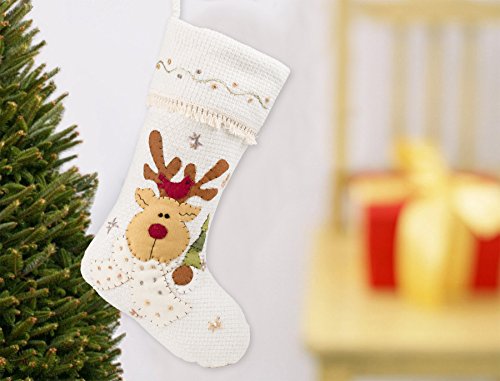19 inch Reindeer Face Applique with Tree on Ivory Embroidered Cuff Christmas Stocking
