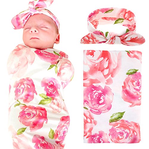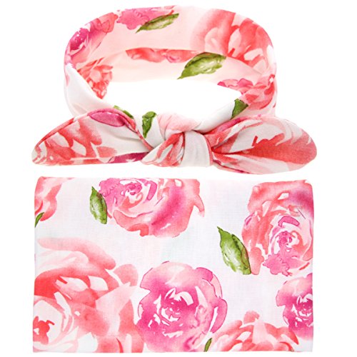Newborn Baby Swaddle Blanket and Headband Value Set,Receiving Blankets, Pink Flower