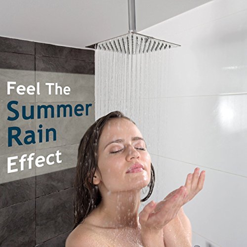 【LUXURY SHOWER】Extra large rainfall shower head, 10 by 10 inch, ultra-thin only 2 mm thick, 100 high pressure silicon nozzles and gloss finish. With the swivel ball connector you can adjust and fix it to any angle you like. It immediately adds luxury look to your shower as if you are in a luxury hotel or spa!