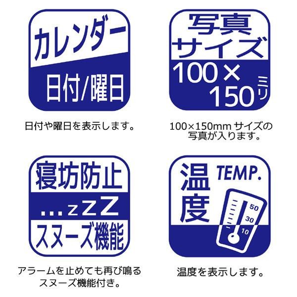 | 仕様 | 使用電源:単4乾電池×2 音声録音機能(10秒間・アラーム音に設定可) フォトサイズ:100×150mm |