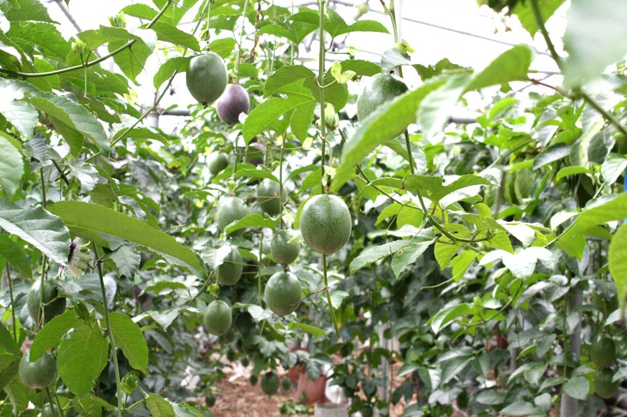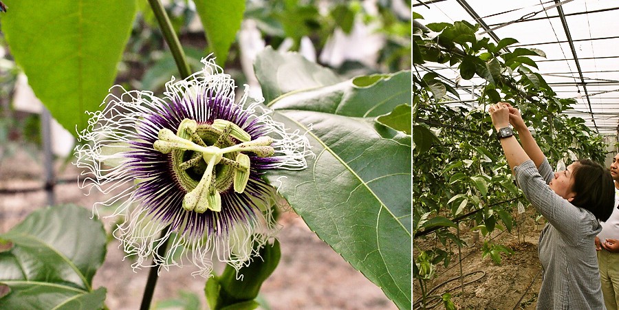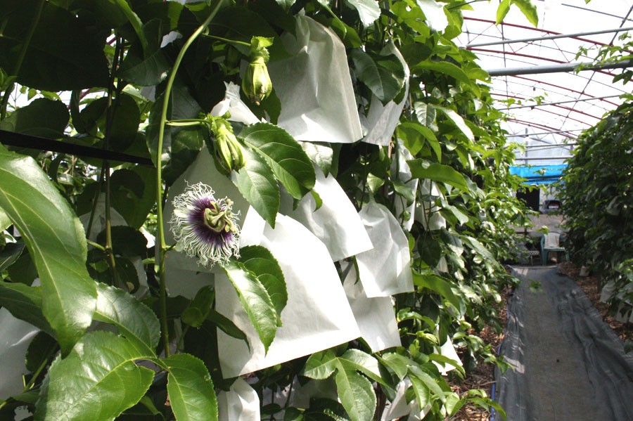 ![]() ↑こちらがパッションフルーツの花。受粉作業はひとつひとつ手作業で行います。(アッコ店長も受粉のお手伝い中。) | ||