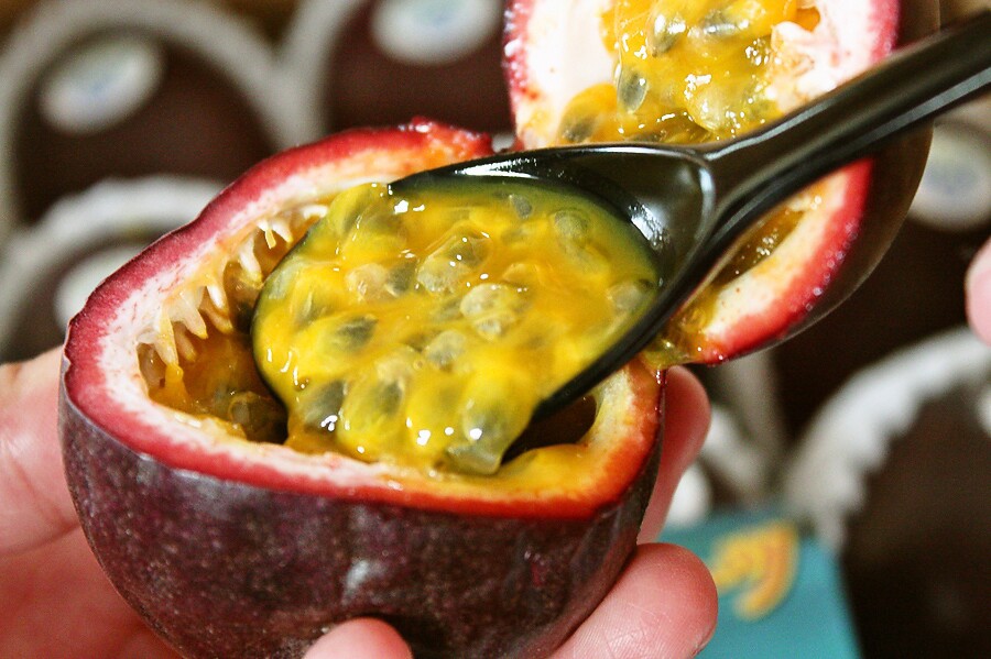 | 表面がつるっとしている物は甘酸っぱく、酸味を楽しめます。 常温保管で追熟(表皮がシワになると)すると酸味が和らぎ甘味が増します。 ご希望の食べごろになったら、冷蔵庫に冷やしお早めにお召し上がりください。 パッションフルーツをカットし、そのままスプーンですくって“種ごと”食べます。 種をかまずに喉越しを楽しむ方もいますが、個人的には種をバリバリ食べるのが大好きです。 丸ごと冷凍保存すると食べる時に中がシャーベット状態で楽しむ事も出来ます。 | ||