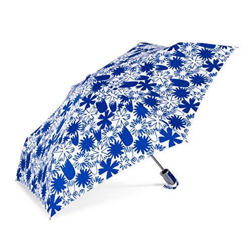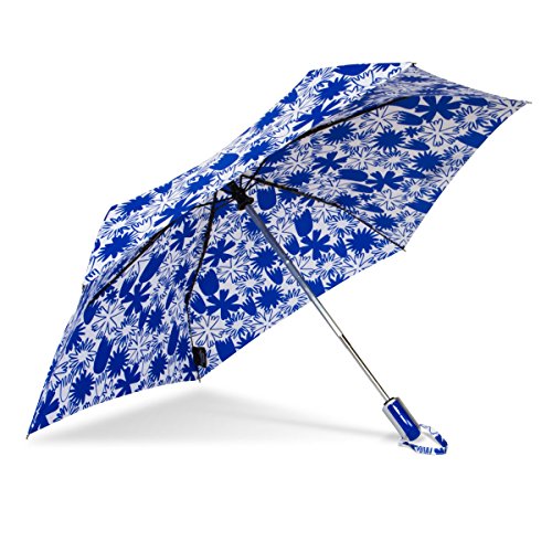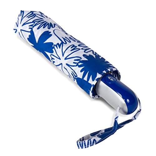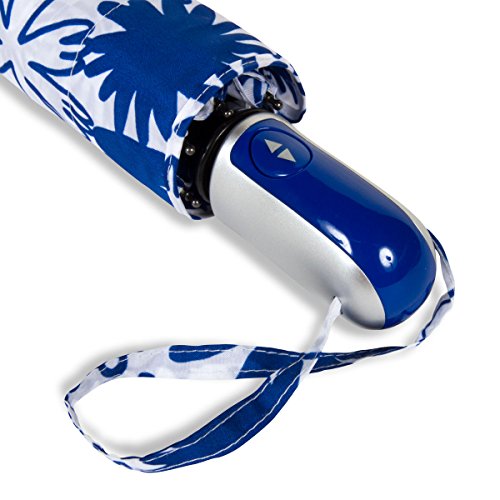 Product Description The RainEssentials® Auto Open Auto Close Compact Umbrella beautifully combines fashion and function. The push button auto open auto close feature makes operation a breeze and it comes in several fabulous seasonal prints to match any trend and every outfit. Includes a matching bright royal blue and white floral self fabric case and matching wrist strap. 0