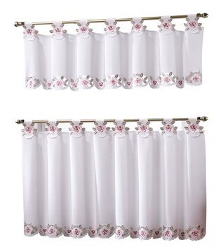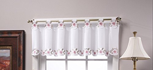 Capri Window Curtain Collection by Today's Curtain, features fine reverse embroidery, multi color, rich cutwork, textured fabric, tab top header curtains, engineered scallop bottom, all polyester, easy care, machine washable, Select multiple pieces of valances to create your window top treatment, or tiers at your choice to decorate your window. Available colors in white fabric with rose color embroidery, or ecru fabric with peach color embroidery.Feature