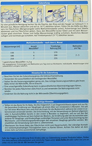13,6 g Holle Folgemilch auf Ziegenmilchbasis 2 + 90 ml abgekochtes Wasser = 100 ml trinkfertige Nahrung.