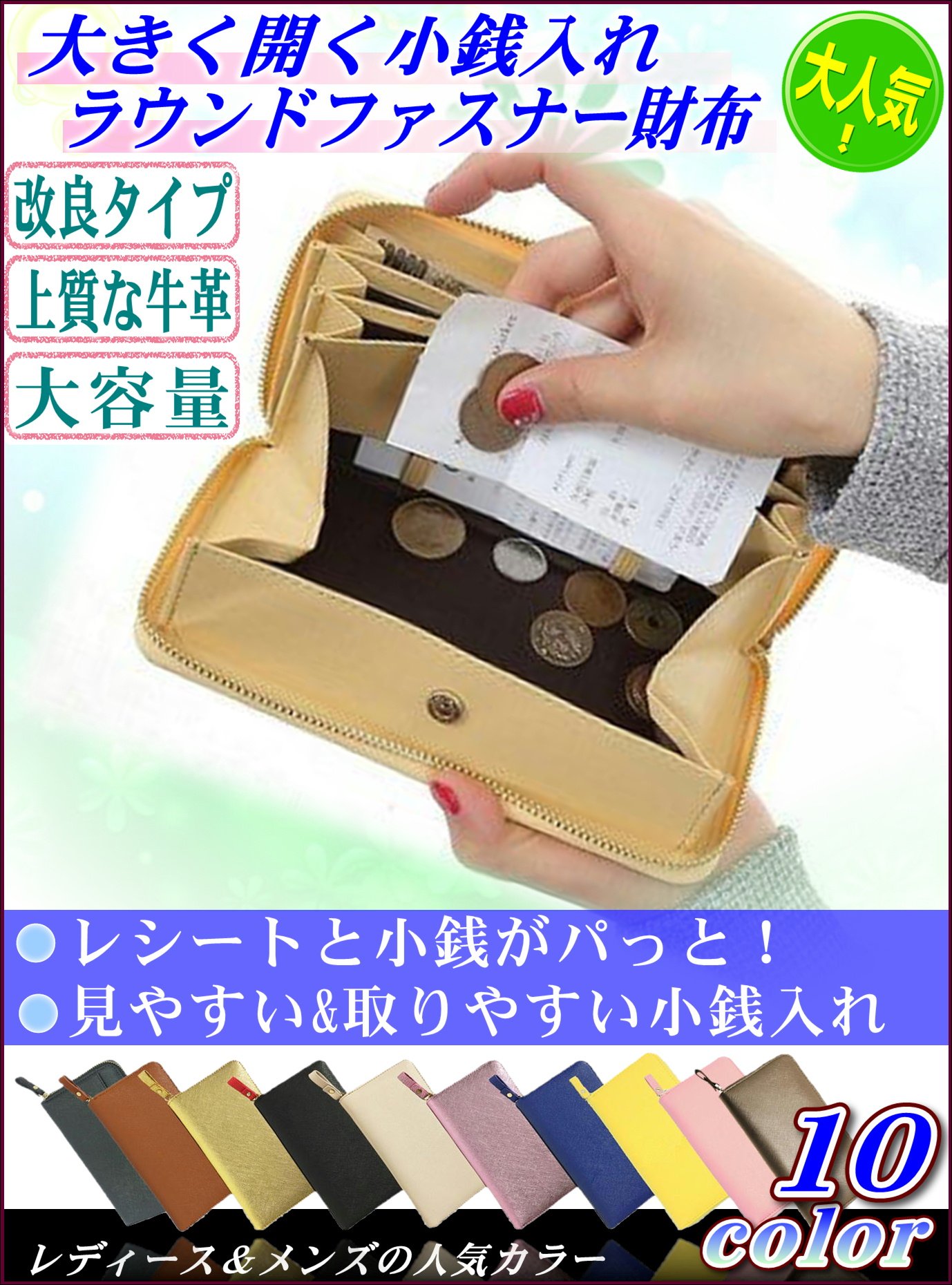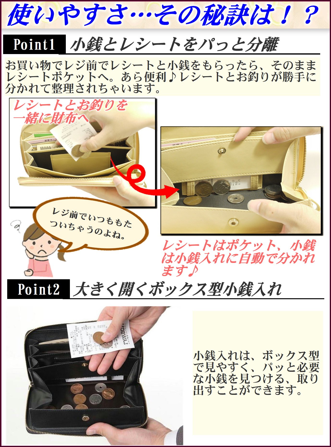 です It is a long wallet of a round fastener with a receipt pocket that automatically separates the coin and the receipt without panic in front of the cash register.