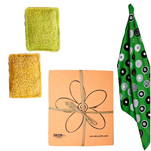 Skoy Sponges 4-pack, Skoy Towel and Loofah Natural Cleaning Sponges Gift Set For An Ecofriendly Kitchen (Green)