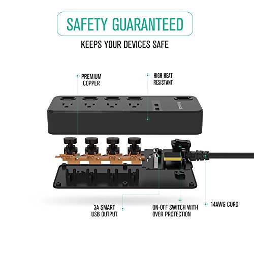 SAFETY GUARANTEE: This power strip outlet is safety designed with overheat, over-voltage, over-current, short-circuit protection and anti-fire ABS+PC material.