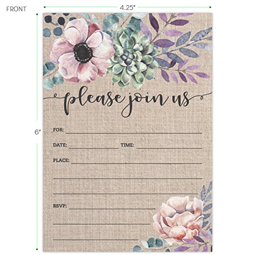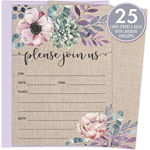 Rustic Burlap Invitations with Florals. 25 Lavender Envelopes and Fill in the Blank Invites for Bridal Showers, Baby Showers, Birthdays, Graduations,...