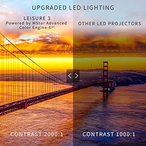 Product Dimensions:7.9 x 5.9 x 3.1 inches Item Weight:2.12 pounds Shipping Weight:3.57 pounds (View shipping rates and policies) ASIN:B078KF8CSX Item model number:Leisure 3 Customer Reviews:4.4 out of 5 stars 457 customer reviews 4.4 out of 5 stars Best Sellers Rank:#2 in Electronics > Camera & Photo > Projectors > Video Projectors #2 in Electronics > Office Electronics > Video Projectors & Accessories #34 in Electronics > Televisions & Video Date first listed on Amazon:December 21, 2017