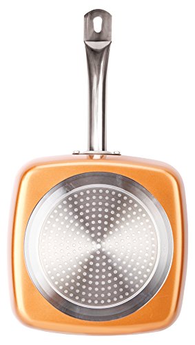 See the difference of cooking with copper infused ceramic. The revolutionary design means nothing ever sticks. 5 in 1 cookware ( saute, fry, grill, roast and bake). The scratch resistant surface keeps the pan like new. Copper infusion allows for an even disbursement of heat that builds fast for delicious results. Forget oils, butter or grease, food just slides off. 9.5", heat resistant, oven safe up 850 degrees, induction base and dishwasher safe. PFOA, PFOS and PFTE free.Feature