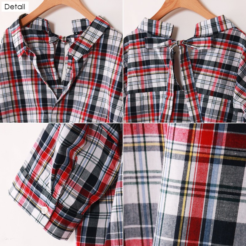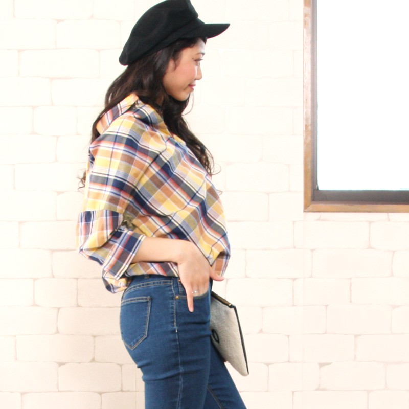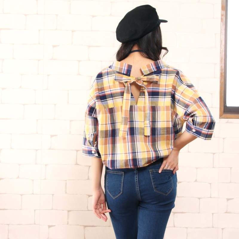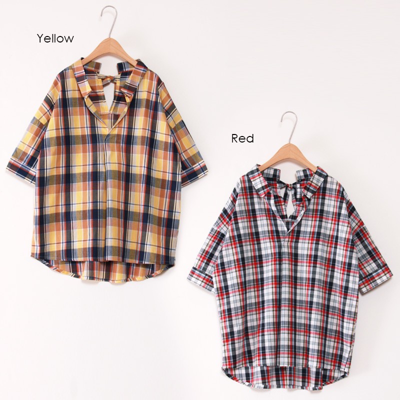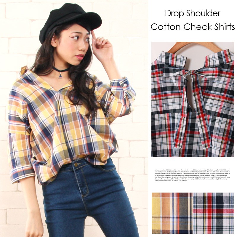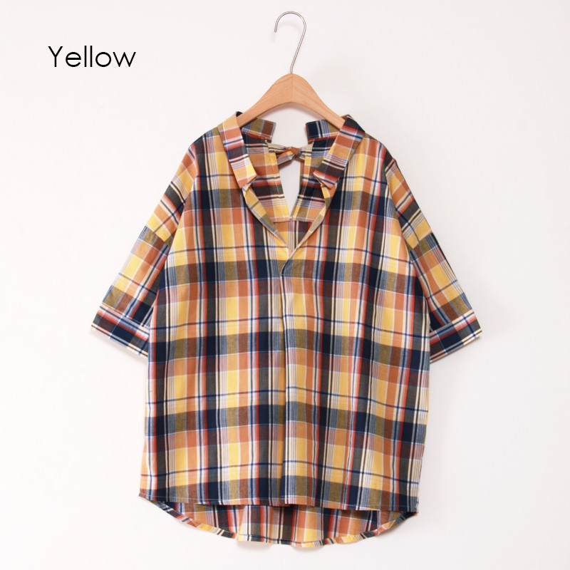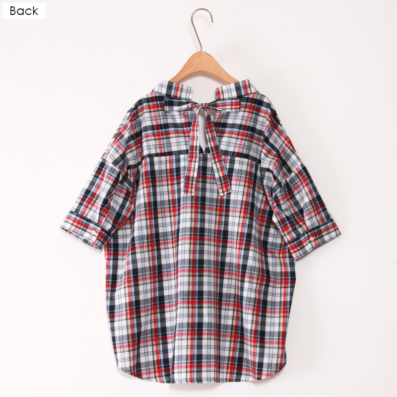ゆるっとルーズな着こなしがオシャレなチェックシャツ今季人気のスキッパーデザインでスッキリとした印象に仕上げました。シャツをインすればトップスに♪出して着ればチュニックに♪カジュアルなチェックシャツだけど後ろリボンデザインになっているのでかわいらしさもあって◎Mサイズモデル身長:162cm