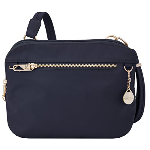 This stylish and functional Crossbody Bag is perfect for travel or outings. It features two locking compartments. The front compartment has a zip wall pocket and a tethered key clip with LED light. The back compartment has RFID protected passport and card slots to keep your personal information secure, three wall pockets, and a zippered center compartment for added security. The slash-resistant, adjustable and removable shoulder strap can be secured to a stationary object to prevent a grab and go.Feature