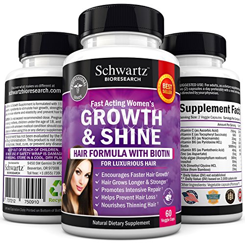 -. Binding : Health and Beauty -. Brand : Schwartz Bioresearch -. EAN : 0737212750910 -. Feature : Fuller, Thicker, Longer Hair is Finally Possible: Schwartz Bioresearch has developed the best supplement exclusively formulated for women to promote luxurious hair and fast hair growth from within (vitamins for hair growth & hair regrowth). Premium active ingredients including biotin (biotin 5000 mcg) offer a complete hair solution targeted for women needs while preventing hair breakage for thick, lush locks. (better than a hair growth shampoo) / Back by Amazon Money Back Guarantee: At Schwartz Bioresearch we stand behind our products. If you are not fully satisfied with our Hair Growth Product (it can work well as hair skin and nails vitamins) you will receive a full refund no questions asked! / Incredible Shiny, Silky Hair: Say goodbye to dull, dry, lifeless hair. This exclusive hair growth vitamins with biotin for hair growth make hair soft and smooth, locking in nourishment and making hair healthier and damage-free and reduce shedding, increase volume & thicken hair. Will also improve hair skin nails. / 100% Safe and Natural Proven Ingredients: Schwartz Bioresearch is a leading brand in 100% natural, professional grade dietary supplements. Proudly manufactured in the USA, with strict adherence to Good Manufacturing Practices (GMP). All batches are 3rd party tested to guarantee the purity and quality of the ingredients with Non-GMOs, no fillers, no binders and no artificial ingredients. Dermatologist approved. / Initial Results in Just 4 Weeks: This supplement may address vitamins deficiencies that could be the cause of thinning Hair, Hair Loss, bald patches, lack of hair regrowth, dry hair, oily hair, brittle and weak hair. Customer have reported Lustrous and healthy hair, silky hair, longer and stronger hair while Hair regains density and shine for a beautifully healthy feel. For best results this product should be taken for 3 months. -. IsAdultProduct : 0 -. Label : Schwartz Bioresearch -. LegalDisclaimer : These statements have not been evaluated by the Food and Drug Administration. This product is not intended to diagnose, treat, or cure any disease. -. Manufacturer : Schwartz Bioresearch -. MPN : LE -. PackageQuantity : 1 -. PartNumber : LE -. ProductGroup : Health and Beauty -. ProductTypeName : HEALTH_PERSONAL_CARE -. Publisher : Schwartz Bioresearch -. Size : 60 count -. Studio : Schwartz Bioresearch -. Title : Hair Growth and Shine Vitamins with Biotin Formulated for Women. Gluten Free Non-GMO hair growth vitamins. Longer, Stronger, Silky and Soft Hair. Developed by Doctors, Made in USA Money Back Guarantee -. UPC : 737212750910