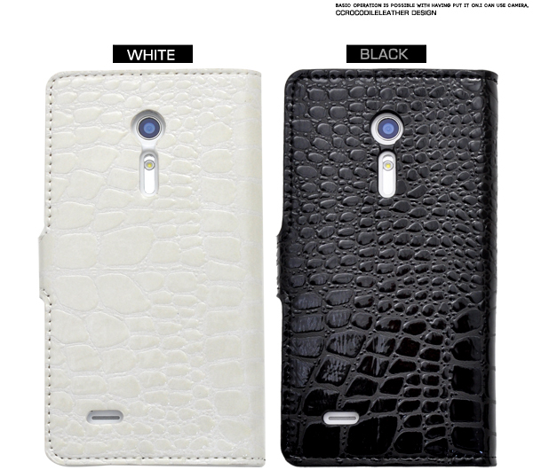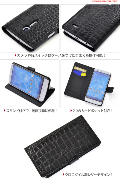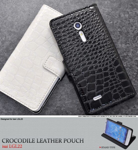 クロコダイルレザーデザインのisai LGL22用スタンドケースポーチ。