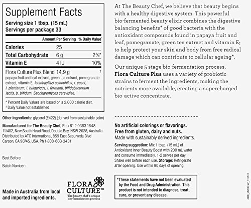 -. Feature : A Delicious Organic, Bio-Fermented, Enzyme-Packed Probiotic Concentrate / Designed To Give You A Daily Shot Of Nutritional Support That Helps To Protect Your Skin + Body From Free-Radical Damage & Cellular Aging / Specifically Formulated To Repair + Rejuvenate Skin, Fight Free Radicals, Address Fine Lines + Skin Firmness & Boost Overall Skin Radiance / No Artificial Colorings, Flavorings Or Preservatives & Dairy, Sugar & Gluten Free / 16.9 fl oz / 500 ml