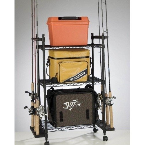 -. Title : Keep Fishing Poles, Rods, Reels, Tackle and More Neatly Organized. This Storage Cart with Wheels Has Adjustable Shelves and Hooks. The Rack Will Fit Nicely in a Corner of Your Garage and Keep All Your Fishing Tools and Essentials in One Place.