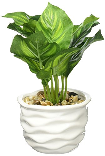 - Boasts a brightly green leafed artificial plant complemented by a wavy ridged modern white pot.
