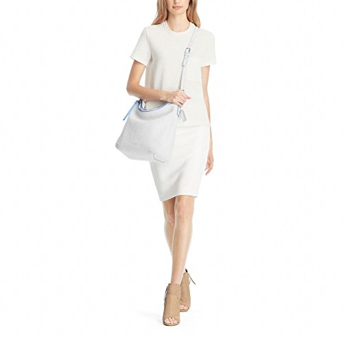 Color: white blue oxford, Edgepaint leather , Gold stone Hardware Top Zip Closure, Inside zip, cell phone and multifunction pockets Center zip compartment , Magnetic snap closures, fabric lining Handles with 10" drop , 1 zipped back pocket, 1 zipped pockets, 2 open multi-function pockets 13 1/4" (L) x 11 1/2" (W) x 5 1/4" (W)Feature