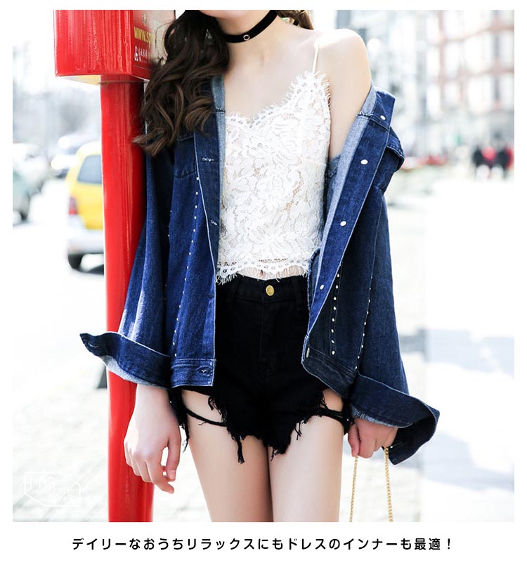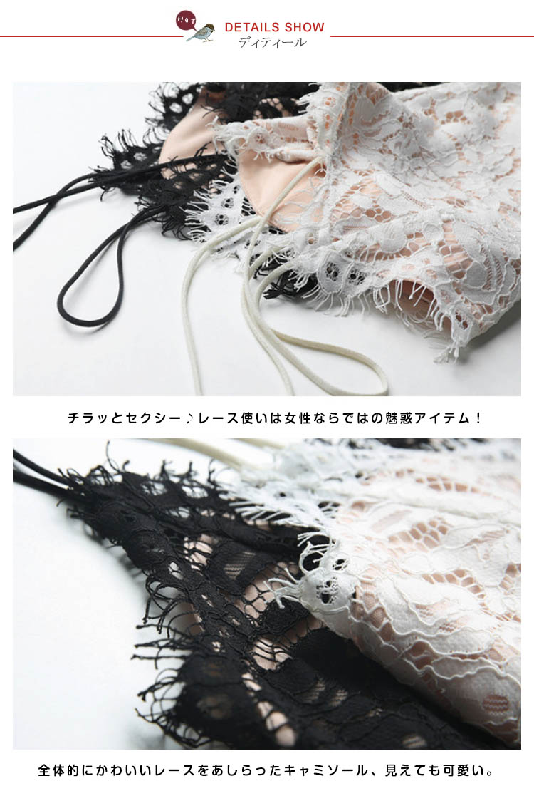 | 総レース素材でリッチに。ジャケットインにも最適な見せキャミソール。軽くて柔らかい生地は肌にやさしくて、爽やかな着心地♪デイリーなおうちリラックスにもドレスのインナーも最適! | |