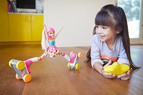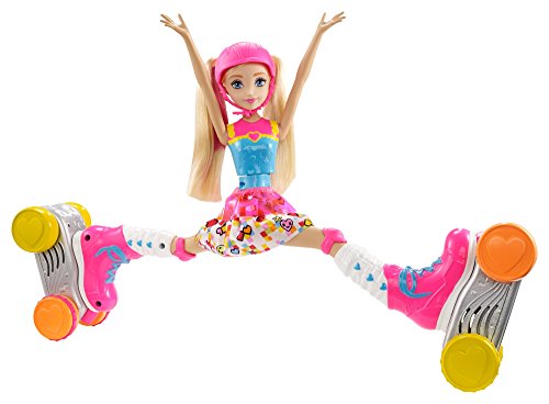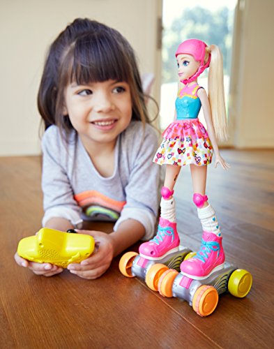Be a game-changer with RC Barbie roller skater doll! Inspired by Barbie Video Game Hero, she's ready to roll into action with all kinds of amazing moves. Use the star-shaped remote control to send her forward or backward. Press the smile button to play music to accompany her moves. Then press another button to see Barbie doll perform a split -- and a 360-degree spin! It's a total wow moment! Barbie RC roller skater doll is ready to score game points in a colorful anime outfit with molded bodice, print skirt with transparent peplum and removable helmet for her pink-streaked hair. Her skates are oversized and colorful for extra-big fun! Colors and decorations may vary.Feature