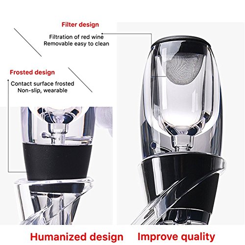 Studio : Jiajun Bao Publisher : Jiajun Bao Product Description Makes Your Wine Taste Better in Seconds Using a decanter can take too long. This is a NEW approach to aerating wine, that makes wine taste significantly better in just seconds. just and pour your wine through it into your glass. You can hear a slight aeration noise as it goes through。 That's the sound of wine opening up, as it enters your glass, resulting in a superior tasting glass of wine. Rapid Wine Oxidation For Optimum Taste Results. Using the Bernoulli Effect, wine aerator injects air bubbles into your wine, dramatically improving your wine's aroma and flavor. Strictly for people that are really into great wine and are willing to immerse themselves into a whole new wine tasting experience. Perfect Aeration This wine aerator draws in and mixes the proper amount of air for the right amount of time; your wine can breathe instantly. onvenient Design No leaks or drips from the aerator or aeration holes if you pour too quickly. No overflow problems when pouring too quickly into an aerator with a small cavity. No neck leaking or fitting problems. Aerator and stand are dishwasher safe. 0
