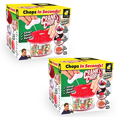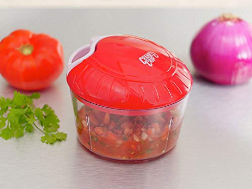 Making food prep fun again. Your bulky electric food processor is noisy and takes up too much counter space. Crank Chop is a compact, manual food processor that does not require electricity. Chop, dice, and puree with a pull of the cord! Make salads, salsa, tabouli, stir fry, and more with ease. You can even make homemade baby food! Crank Chop measures 5-inches by 5-inches by 5.5-inches so it is small enough to stash in your drawer or cabinet when not in use. Take it along camping, in the RV, work, or the college dorm. How it works. Using Crank Chop is really easy. Just place your food in the bowl and place lid. Crank to chop! Then serve. The more you crank, the finer the chop. Crank Chop has three powerful blades that simultaneously slice through food with each pull of the cord. Pull the nylon cord a couple of times for a nice dice or several for a rich puree. Crank Chop's bowl has a 2 cup capacity. And the bowl and blades are top rack dishwasher safe for easy clean up (lid should be hand washed only). What's in the box?