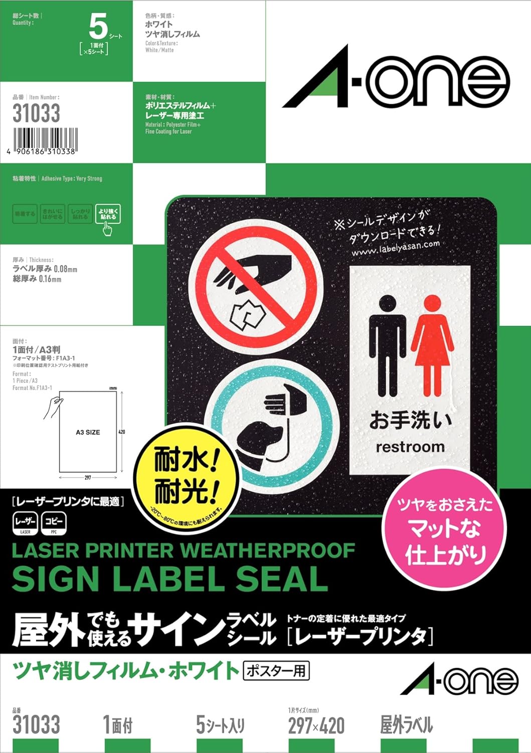 ツヤ消しフィルム・ホワイト ポスター用/材質:ポリエステルフィルム/標準総厚み:0,16mm/ラベル厚み:0.084mm A3 1面 ノーカット/シートサイズ:A3判(297mm×420mm)/ラベルサイズ:297mm×420mm(1列×1段) 対応プリンタ: レーザー コピー
