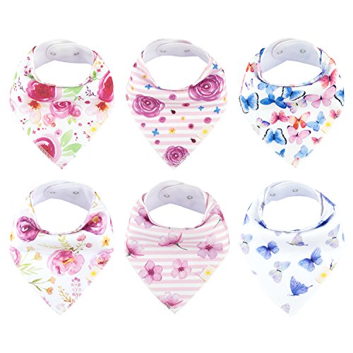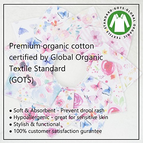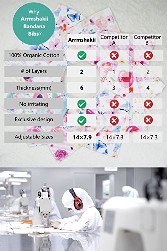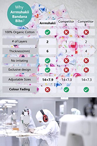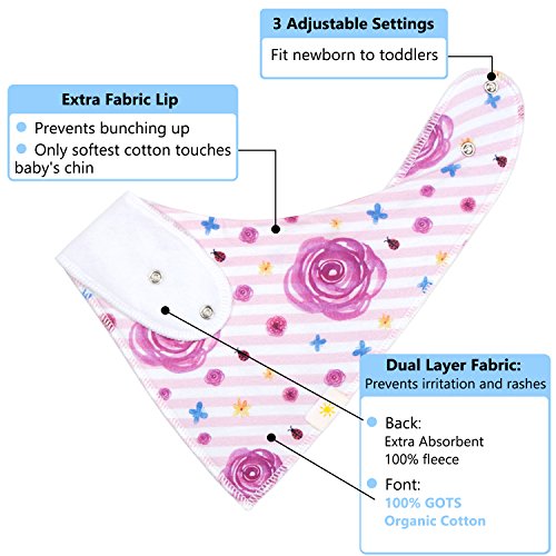 ? SET OF 4 BABY GIRL BANDANA BIBS by Arrmshakii which is a stylish solution to your teething baby's constant drooling. ? We utilize 100% ORGANIC COTTON that is strongly efficient in absorbing moisture. It is soft and hypoallergenic. It helps prevent skin rashes caused by drooling. ?2 NICKEL FREE ADJUSTABLE SNAP CLOSURES to eliminate any risk of skin allergies, making the bibs easily adjustable (no Velcro), ensuring perfect fit as the baby grows up to 24 months. Our baby bibs do not have plastic lining, as it can cause damage and melt during the washing and drying process. ? EXPERIENCE PEACE OF MIND. Our baby bandana drool bibs are Lead Free, Nickel Free, Phthalate Free! ? LONG LASTING DESIGN. DOUBLE OVERLOCKED STITCHES that can stand the wear and tear even after heavy use. ? EYE-CATCHING LOOK AND INCREDIBLY PRACTICAL DESIGN. Our beautifully designed baby bandana bibs for girls: - Keep your baby's clothes germ-free. - Have unique designs that are trendy and fashion-forward, they show off your baby girls' style and you get tons of compliments. They're versatile and are the perfect finishing touch for any outfit. ?PERFECT GIFT IDEA - Whether you want to buy this set as a gift for new parents or as something special for your baby, you won't be disappointed either way. ? Only company offers an IRON-CLAD 100% MONEY BACK SATISFACTION GUARANTEE... If you are not COMPLETELY SATISFIED, return them for a REPLACEMENT OR FULL REFUND; NO QUESTIONS ASKED!