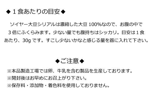 | 原材料 | 名称:大豆シリアル 大豆(国産100%、遺伝子組み換えでない) |