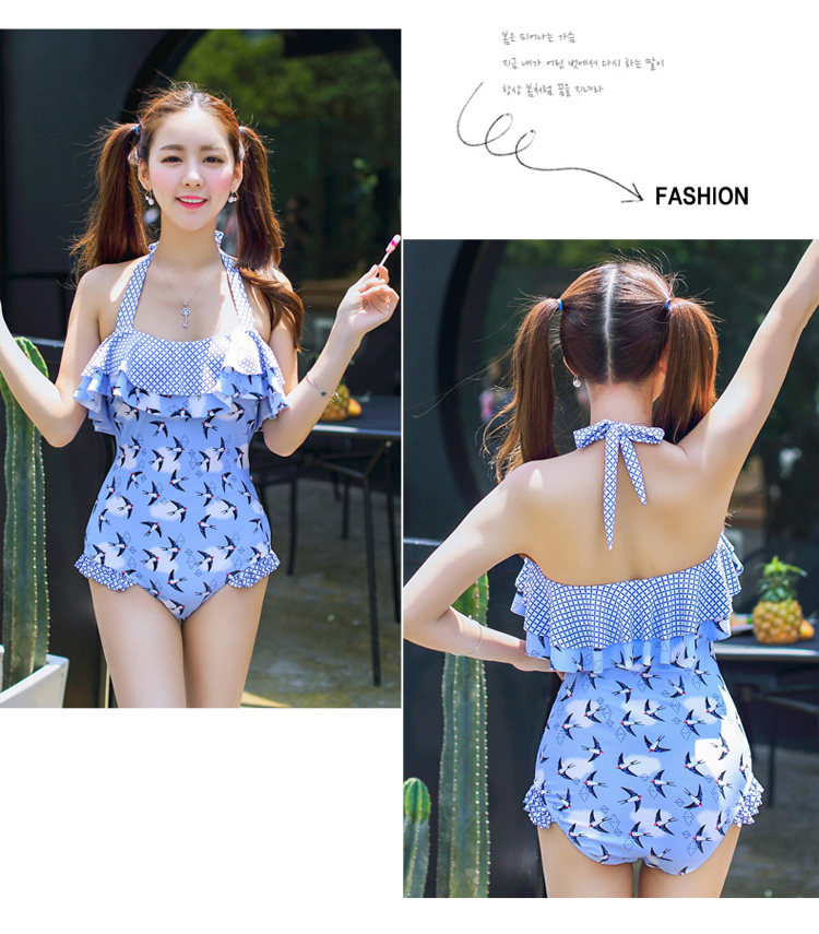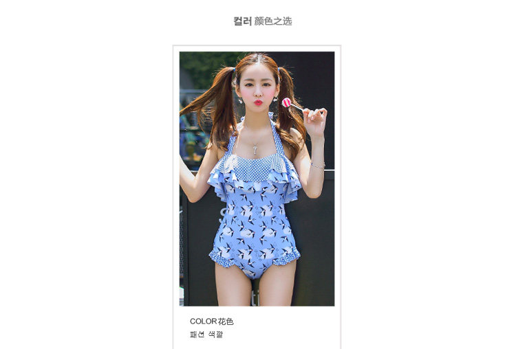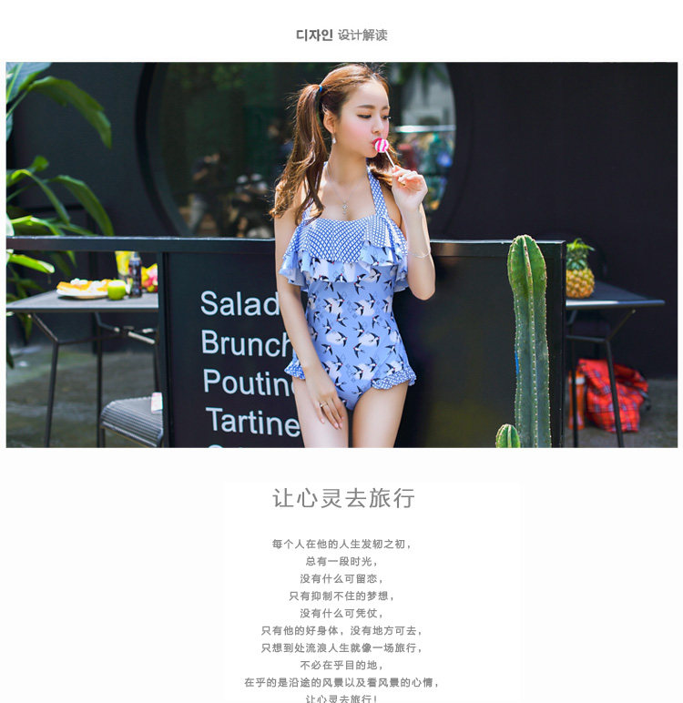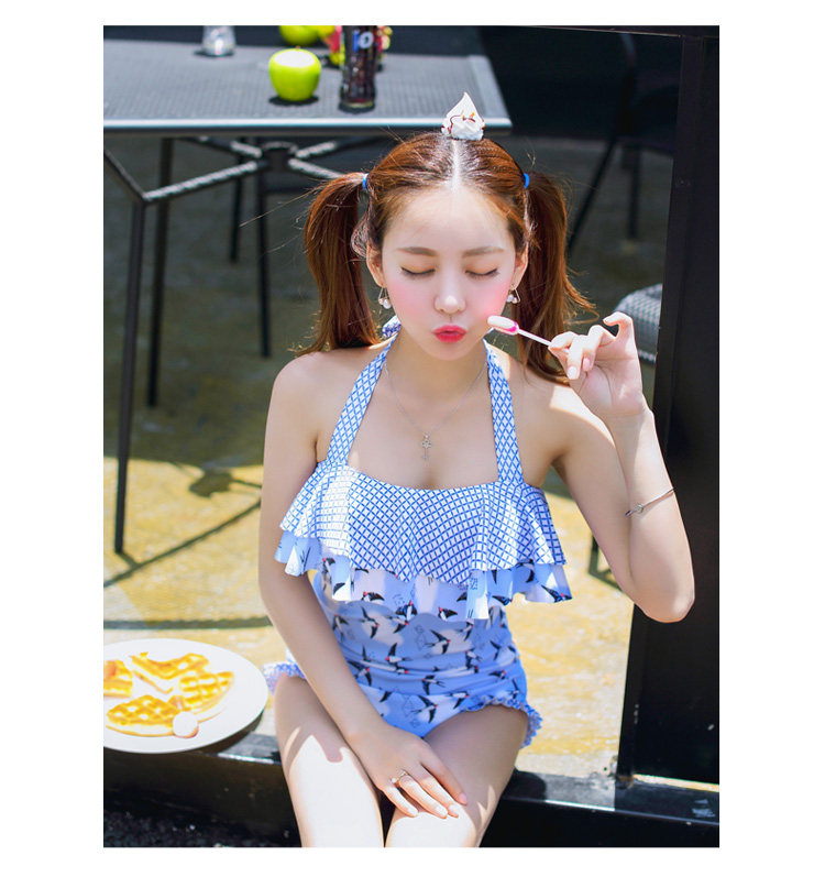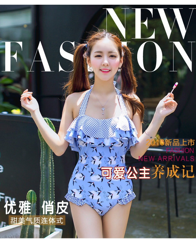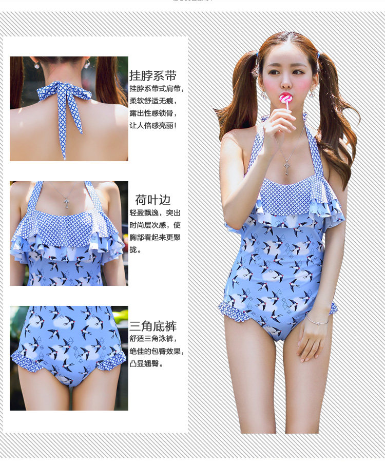 裙式清新三角连体泳衣女遮肚显瘦钢托聚拢大胸小胸荷叶保守游泳装