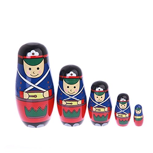 Studio : Winterworm Publisher : Winterworm Binding : Toy Product Description Introduction: Nesting doll, or Matryoshka, is a set of traditional Russian dolls, making its debut in the late 19th century in Russia. The name has somewhat gained around the world and become a notable must-have souvenir from Russia. The doll set consists of multiple separate ones that smaller one is put inside a larger hollower one. The structure is simple yet intriguing as when you seem to constantly discovery little ones inside. It is an engaging experience. Specification: Material: Basswood. Pattern: Here comes our lovely, adorable and cartoon set of nesting dolls in which eight drumming soldiers stand for your inspection. The paintings on these dolls are profoundly brisk with colors. Overall, there are three major colors portioned into practically equal part, the black, the blue and the red. In the black part, the hat is painted with a red band running around. We have blue army coat with white cross in the blue part that has the scent of olden 1900s. In between the cute cartoon face smiles at you. In the red part comes the drum and soldiers' hand drumming, and a crown like thing in the middle of red, hail to his majesty I guess.