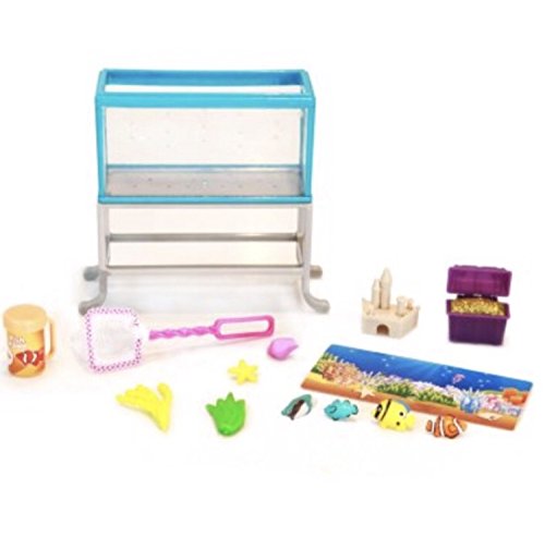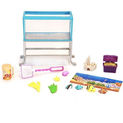 -. Feature : Customizable standing aquarium play set / Aquarium and stand approximately 4.75 inches tall / Includes aquarium, stand, fish net, fish food container, treasure chest, sandcastle, 2 sea plants, seashell, starfish, 4 fish, and a background insert
