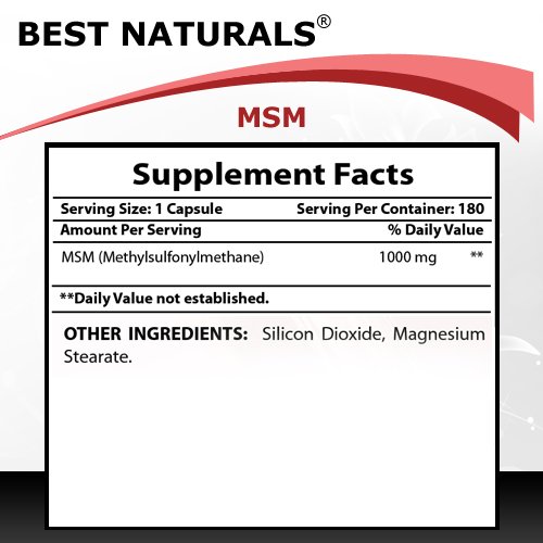-. Binding : Health and Beauty -. Brand : Best Naturals -. EAN : 0817716013060 -. Feature : MSM (Methylsulphonylmethane) is a natural form of organic sulfur found in all living organisms / This natural compound provides the chemical links needed to form and maintain many types of tissues found in human body, including connective tissues / Sulfur is a structural mineral that maintains the strength of various tissues / Support for healthy hair, skin, nails and joints / All Best Naturals products are manufactured in accordance with Good Manufacturing Practices (GMP), among the highest standards in the world -- Proudly Made in USA -- Purity & Potency Guaranteed -. Label : Best Naturals -. Manufacturer : Best Naturals -. Model : 817716013060 -. MPN : 817716013060 -. PartNumber : 817716013060 -. ProductGroup : Health and Beauty -. ProductTypeName : PERSONAL_CARE_APPLIANCE -. Publisher : Best Naturals -. Studio : Best Naturals -. Title : MSM 1000 mg 180 Capsules by Best Naturals - Promotes Joint Health - Manufactured in a USA Based GMP Certified Facility and Third Party Tested for Purity. Guaranteed!! -. UPC : 817716013060