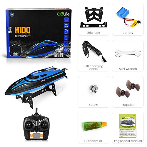 Specifications: -Action Time: 10 minutes? -Charging time: 120 minutes -Remote Distance: 50-70m? -Max Speed: 20km/h? -Control Channels: 4 Channels? -Controller Mode: MODE1? -Features: Cruise,Mini? -Frequency: 2.4GHz? -Battery Capacity: 600mAh -Material: Plastic? -Remote Control: Yes? -State of Assembly: Almost Ready -Age Range: > 8 years old? -Functions: Auto 180 Degree Turnover,Automatic Flip Over,Forward/backward,Turn left/right Dimensions and Weight: Package weight: 0.90 kg?/ 1.98lb Package Size(L x W x H): 37.00 x 12.00 x 28.00 cm / 14.57 x 4.72 x 11.02 inches Package Contents: 1 x GBlife H100 Remote Control Boat, 1 x Wireless Controller, 1 x USB Charging Cable, 1 x Screw, 1 x Lube, 1 x Propeller, 1 x Mini wrench, 3 x Ship rack, 1 x English user manual, 1 x Package box Tips: 1. Before turn on the controller, the boat should be put on the water first. Because the RC boat has Motor protective device and only when the propeller Brass touch the water, then it will be energized. 2. After receiving the RC boat, Please charge it firstly, as we can not ensure every product is fully charged before shipped out. Low-voltage operation will burn and damage the motor. 3. If the cabin has been flooded accidentally while playing, Please open the lid to dry the boat, otherwise the circuit boards will be burned easily. 4. Please avoid violent impact on the hull, otherwise it will cause scratches on the hull. 5. For prolonging the lifetime of the boat, please keep the boat dry after playing. 0