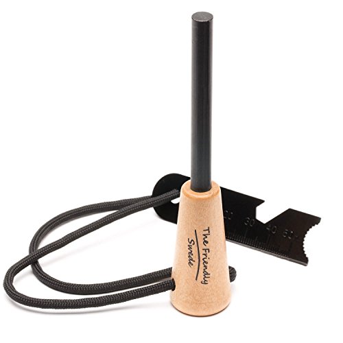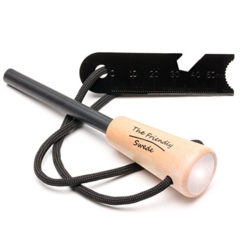 WOODEN HANDLE: The Fire Steel has a practical and stylish wooden handle. The Flint Striker is multifunctional as you find a bottle opener and a ruler. Use the end of it as a scraper for the flint steel.