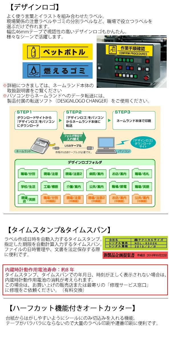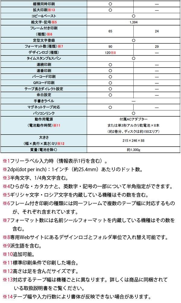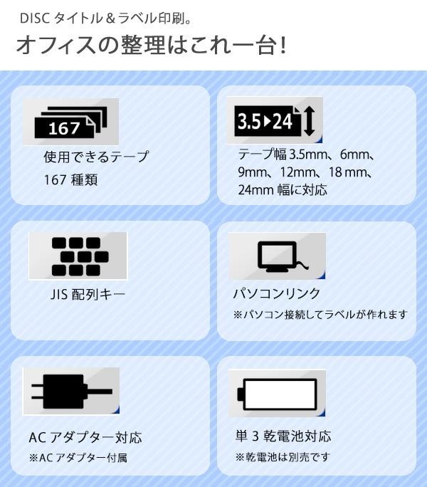 | 付属品 | ACアダプター、電源コード、テープカートリッジ(18ミリ幅×8m)×1、アプリケーションCD-ROM NAMELAND DiSCBiZ SOFTWARE、転送ソフト DESIGNLOGO CHANGER、インクリボンカセット(DISC印刷用)、インクリボンカセット専用アダプター、はじめにお読みください、取扱説明書2冊(入門ガイド・応用ガイド※保証書付・保証期間1年間)、推奨メディア一覧、印刷時の注意事項 |