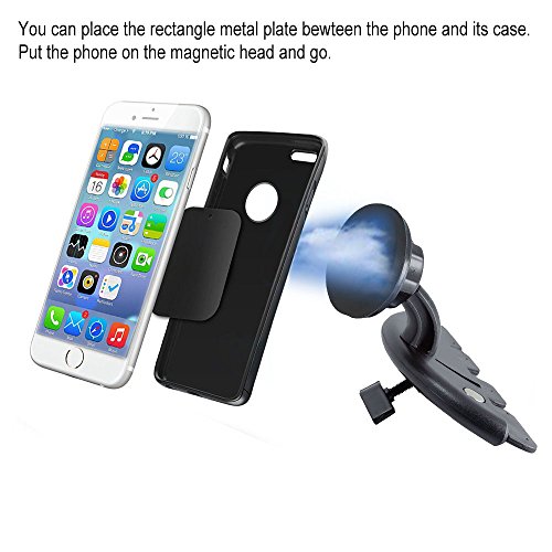 Easy installation: No tools is needed. Insert it into CD slot and screw tight. Adhere the round metal plate to the back of the smartphone or place the rectangle metal plate between the smartphone and the case cover. Attach your smartphone onto the magnetic head and go. This product can also be mounted on the air vent if the grate is as long as 4.7 inches. In this case you need to screw up and insert in the elevated upper securing flap.