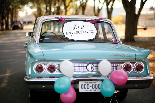 White, water-resistant, foam core car sign with Just Married printed in black. Black border and pre-punched holes for tying with ribbon. Ribbon not included. Each bride is unique and the key to finding everything she wants is an extensive selection with options to coordinate. Take a look at what Hortense B. Hewitt has to offer and you won't be disappointed. With more than 60 years experience making weddings special, HBH has thousands of beautiful wedding day accessories, bridal shower musts, fun wedding favors, bachelorette party novelties and anniversary mementos.Feature