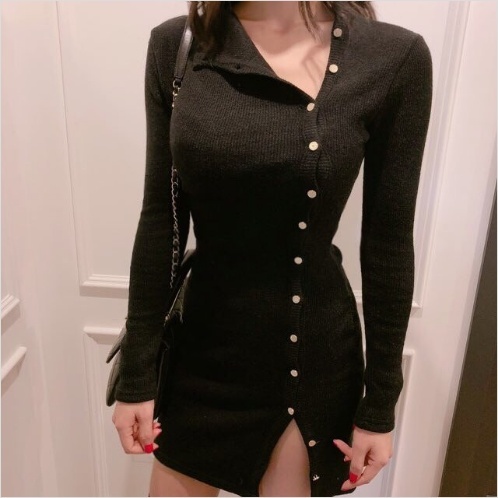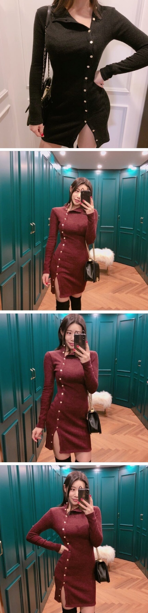 Women`s Golden Buttons Ribbed Mini Dress Black Burgundy