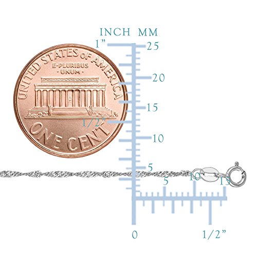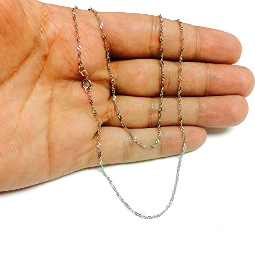 This 10K white gold Singapore chain offers a modern necklace look. At a 1.5mm thickness this chain is available in an 16" 18" and 20" inch length. Perfect for pendants and can also be worn alone. Includes a spring ring clasp to uphold strength and comfort.Feature